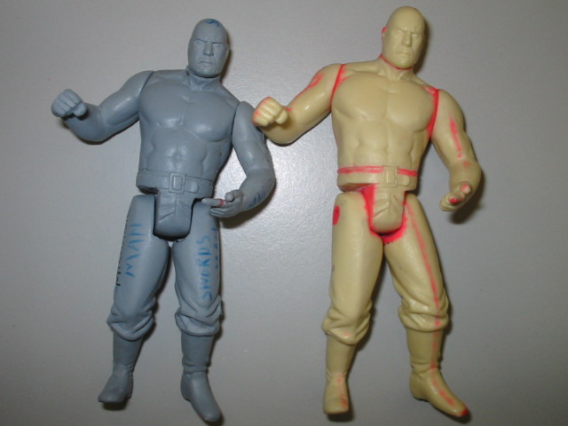 The gray Indy is my original sculpt, and the off-white is the Hong Kong prototype cast. The red marks are actually a putty the factory uses to "tool in" the joint connections.I also originally sculpted Indy with his iconic jacket, but he doesn't wear it in the stunt show, so I had to strip it off. I actually have a cast of his jacketed upper body, but I couldn't find it at the time of this blog! I'll re-post when I come across it...
